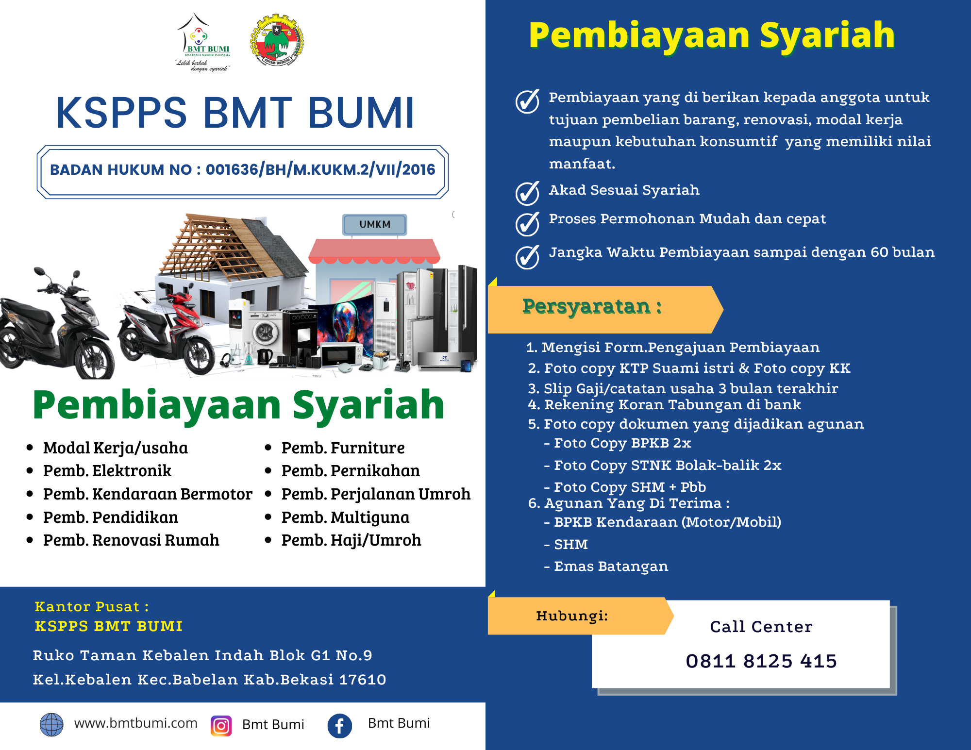 Dilandasi semangat jihad untuk menegakan nilai-nilai ilahiyah khususnya dalam bidang ekonomi, KSPPS BMT BUMI mencoba untuk berkiprah aktif dan mengambil bagian dalam kancah pemberdayaan ekonomi umat khususnya masyarakat Kab.Bekasi. Dengan upaya penanggulangan kemiskinan, Pemberdayaan Usaha Mikro Kecil dan Menengah (UMKM) agar dapat berperan besar maka kehadiran dan peran aktifnya menjadi sebuah keniscayaan sejarah. Hal ini semata ditujukan sebagai wujud nyata ibadah baik secara vertikal maupun horisontal untuk memakmurkan bumi dan menggapai ridha-Nya.Amin.